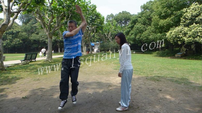 肖师讲解:拗步大劈 肖师给葛仁华指点拗步大劈强调动作要放松,不可僵硬。手腕不可弯曲,在用的时候,用在哪里就曲在哪里。教了葛仁华大劈的正确回身法。