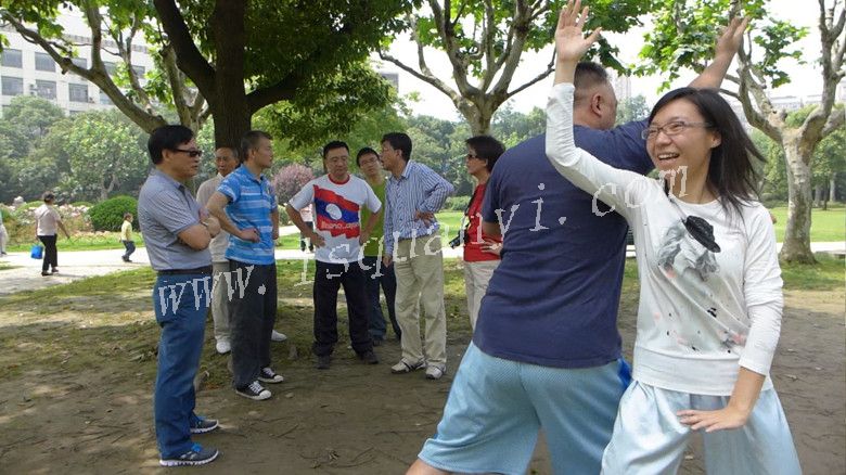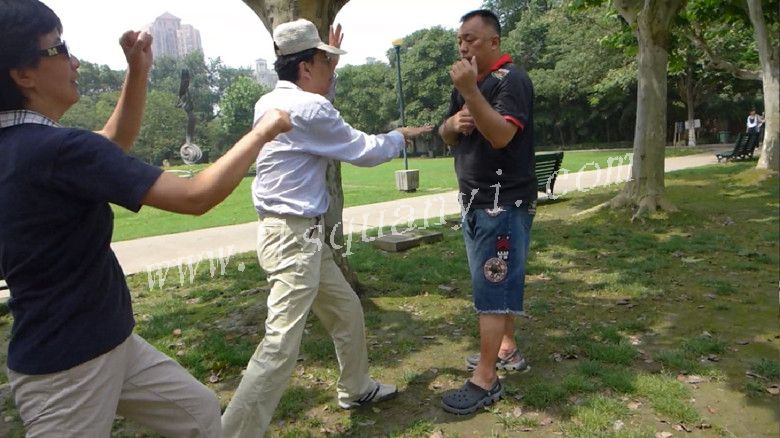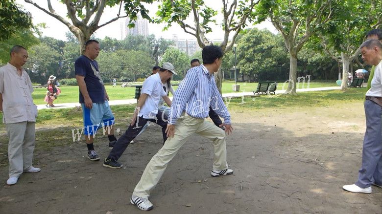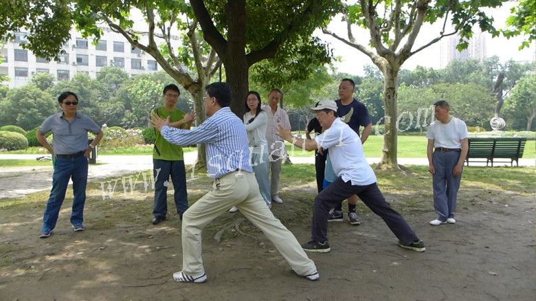 王涛和朱宏滨在打“鹞子入林”,肖师让晓庆师兄充当“大树”,他们撞上的时候,晓庆师兄还会配合的“抖”两下,我瞧着十分有趣,便也开始学了起来。(附图)