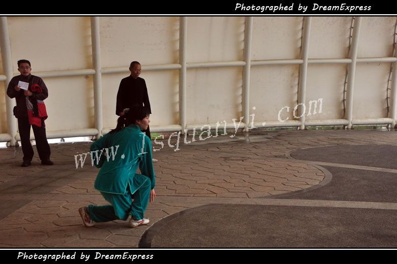十大形演练结束,晓舟身着绿色拳服,如一株绿松,又似一抹春风,演练由小凌老师创编的水浪拳精粹组合“水浪拳表演版”。我由于忙着拍摄录像,顾此失彼,所以相机中只有一张晓舟水浪拳表演版的照片,只有请裴勇、芳芳多多补充。