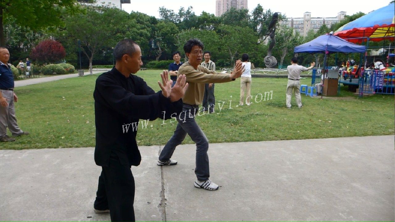 肖师首先给周现龙指导了一头碎碑,在指导时,肖师告知周现龙:拳打一席之地,特意在附近找了一个柱子,让周现龙冲着柱子演练,颇具气势。(附图)