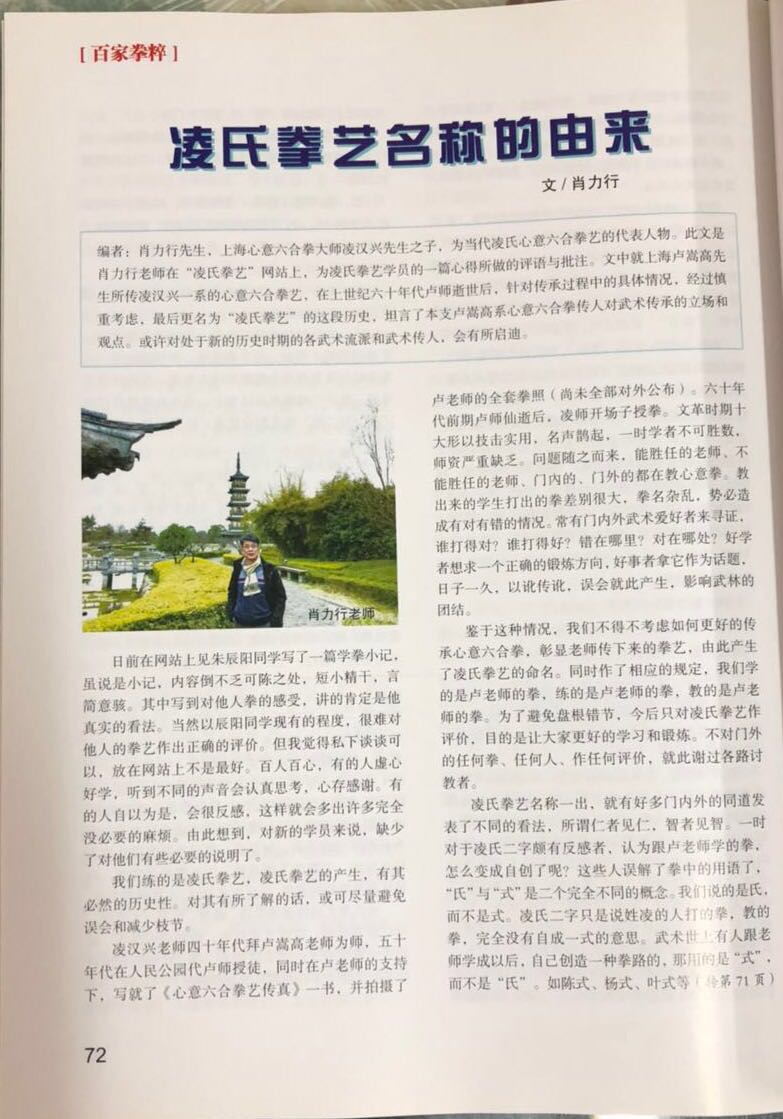 鉴于这种情况,我们不得不考虑如何更好的传承心意六合拳,彰显老师传下来的拳艺,由此产生了凌氏拳艺的命名。同时作了相应的规定,我们学的是卢老师的拳,练的是卢老师的拳,教的是卢老师的拳。为了避免盘根错节,今后只对凌氏拳艺作评价,目的是让大家更好的学习和锻炼。不对门外的任何拳、任何人、作任何评价,就此谢过各路讨教者。