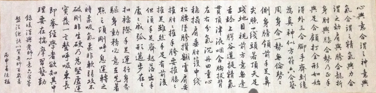 今天看到德楹的“心意六合拳盘法总诀”书法作品,如愿所偿,终于完成了这项放在心里如此多年的心愿。说句不免俗的话,为自己,为团队,为凌氏拳艺,为中华武术,对其表示衷心感谢!说句另类的话,挑战与机遇并存,德楹要好好感谢我,没有我的力邀,不可能有此佳作,也不可能激发潜在的能力,这也是发自肺腑的。