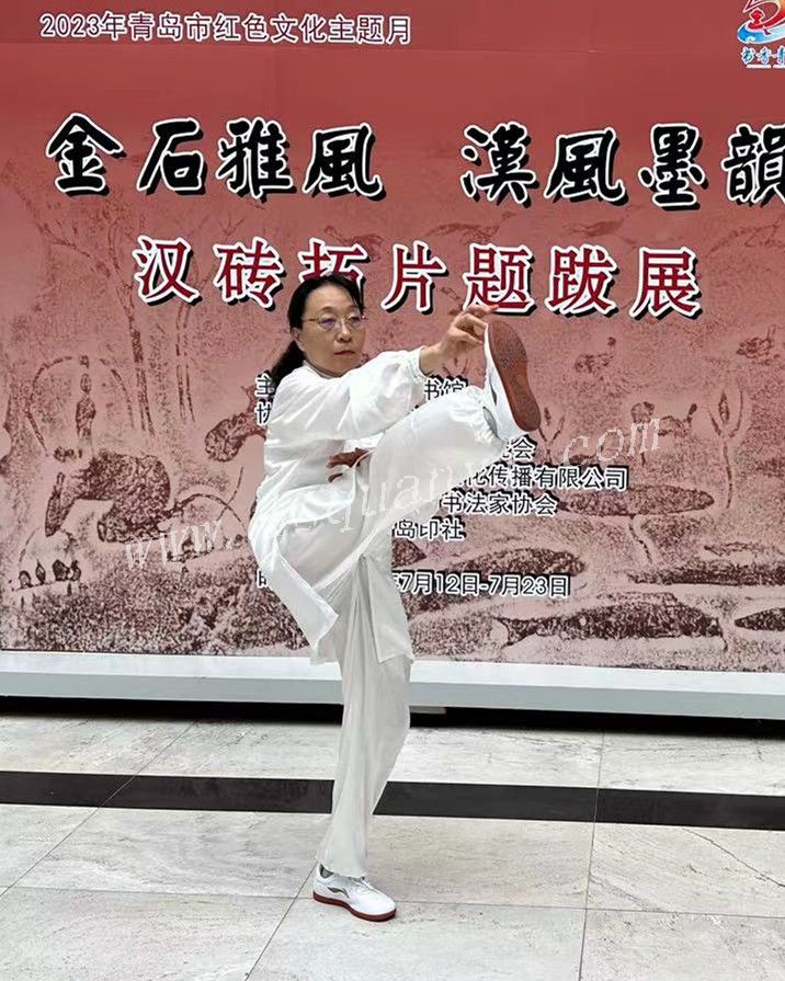 老师一行不顾舟车劳顿,入住后稍稍安排一下,便顶着烈日出门,选看可拍定型照的地方。之前我们看了几处,老师都以专业的眼光迅速否定了。老师和国燕教练慧眼,很快选定市图书馆内的一处场地,立即投入拍摄。老师讲解、示范、纠正、扳拳架,国燕教练和侃希教练边拍录边不时地翻译、解说,一直忙到管理人员下班,我们才收工。我本以为自己会不好意思在老师和两位教练面前做动作,会拘谨放不开,没想到在老师的轻松幽默、平易真诚和温煦鼓励中我的自缚很快就风化了。