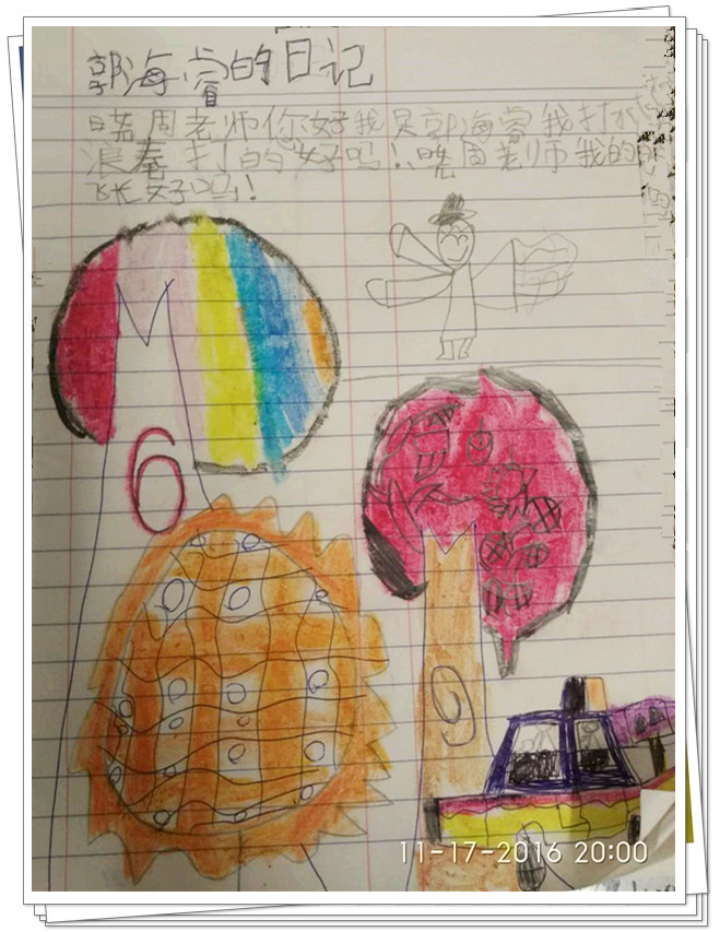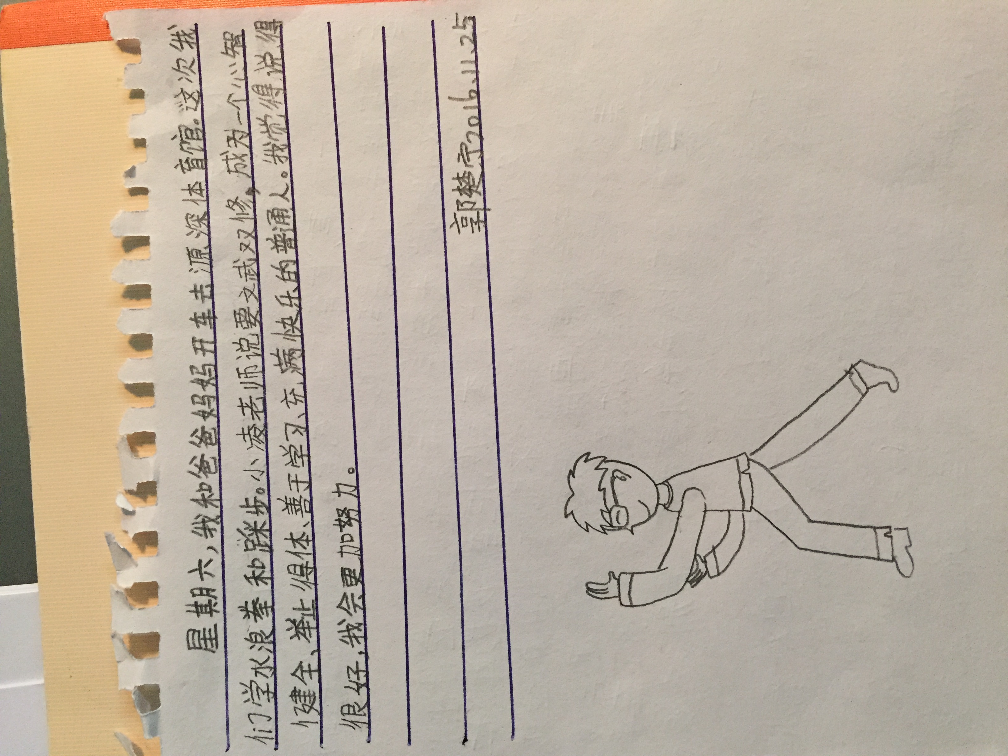 刚上一年级的郭海睿自创的图文版学拳日记,右上角小人儿是海睿在打拳的自画像。 [此帖子已被 晓舟 在 2016/11/24 13:22:23 编辑过]