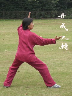单手朝阳 赵丹的记录: “其中“丹凤朝阳”中重心在后,右腿蹬直起身,右手上摆,右腿屈膝下坐,左手上摆,两手上摆都要沿着身体前正中线的位置,起身右手从左手上穿出,虎口朝下,胯左腿” 晓舟的记录: “单手朝阳一记中双肩的松沉、引领的交替至关重要” 翻江搅海 要点有二: 1.定式时两手向上竖起 2.定式后起右手时重心在前,然后起左手时重心在后