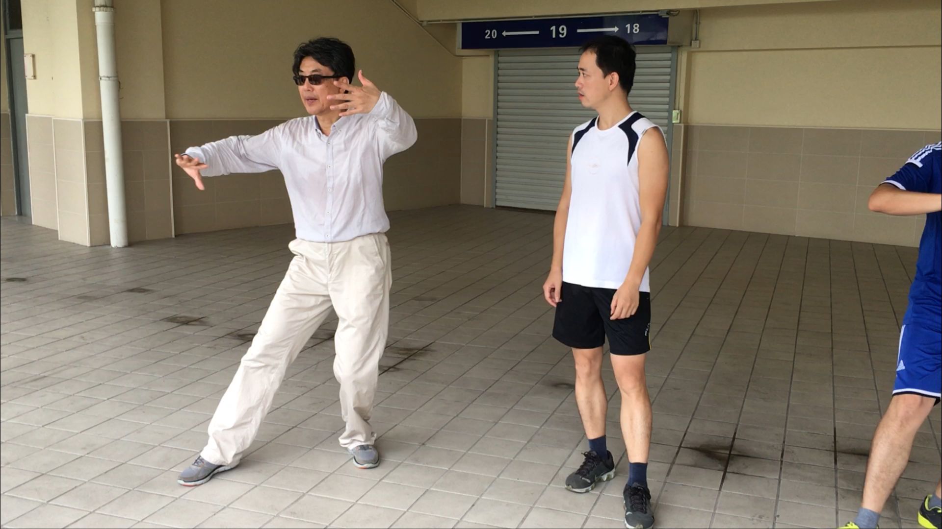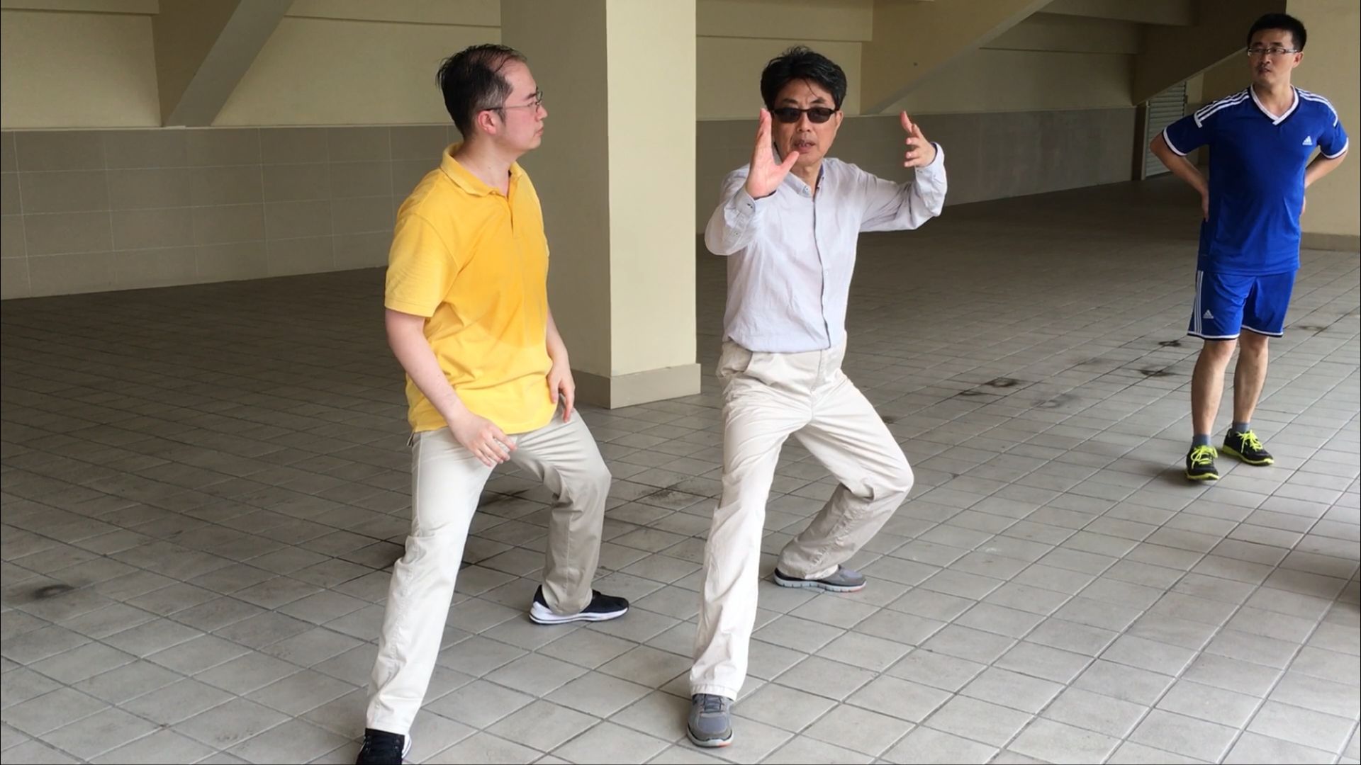 建军,肩膀先动的问题好了很多,但是手腕还是显得有些过于用力,而手指过于弯曲,皆不自然。肖师在起式转臂和注坔贯月之前转身相合的两记中,给建军纠正了形于手指,尤其用中指钻掌来强调指气坚挺的意念。从、肘、腕、指尖气通三关,一气贯通,打出指气放长。指气钻地、指气连天对则指气相连