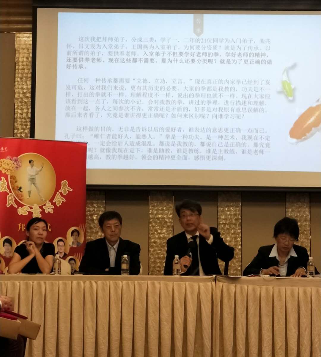 这次我把拜师弟子,分成三类;学了一,二年的21位同学为入门弟子,栾兆怀、吕文发为入堂弟子,王国燕为入室弟子。为何要分资质?就是为了传承。以前所谓的弟子,要供奉老师。入室弟子不但要学好老师的拳,学好老师的精神,还要供养老师。现在这些都不需要,那为什么还要分类呢?就是为了更正确的做好传承。