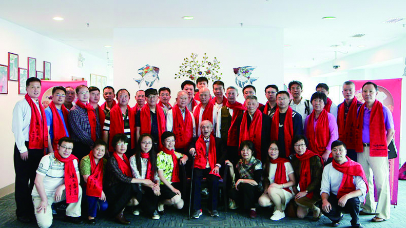 沙龙给每人有100岁的凌老师题写中文,肖师题写英文的“凌氏拳艺”标示物大红色的毛巾。用餐后,大家系上凌氏拳艺标示物毛巾与凌老师拍了集体照。