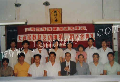 一九八七年九月凌师在上海市气功研究康复中心气功班开学典礼上与工作人员合影(前排中间穿西装的是凌汉兴老师),龙华寺持寺世衔法师在座。
