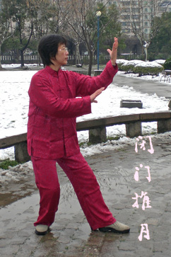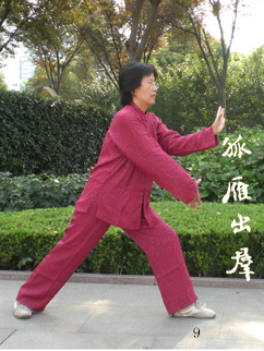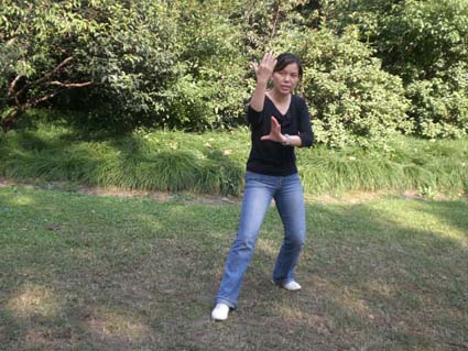 [晓舟教练]两脚呈“丁八步”站立,身体重心前三后七,松肩坠肘,两手展开如鸿雁张翅。
