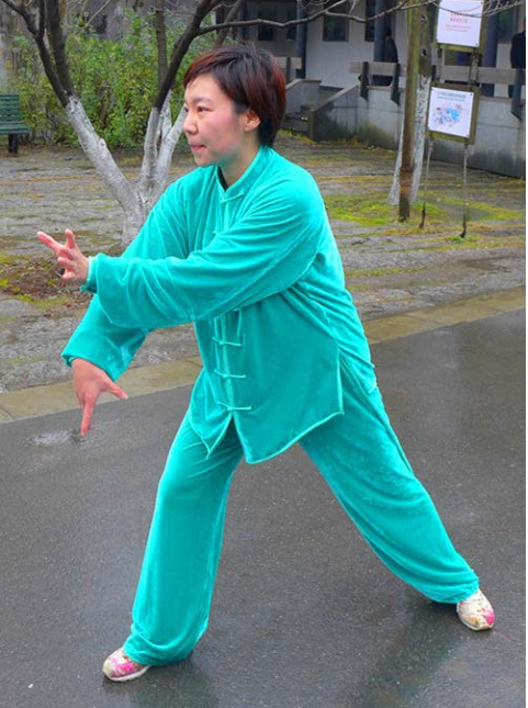 [小凌老师]:有一个地方要纠正一下,后脚不是踮的,是平的踩地。后脚上前的时候,是膝关节弯曲,小腿绕着膝关节上去后,踩下来。像鸡走路一样,嚓!嚓!嚓!。