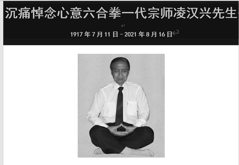 心意六合拳一代宗师凌汉兴先生于2021年8月16日晚1040分无疾羽化!!!享年105岁。此因疫情期间,一切从简。凌门弟子和各界朋友,可在网上寄托哀思。