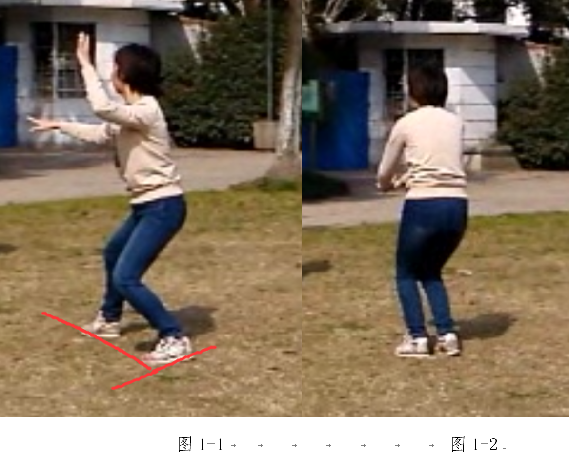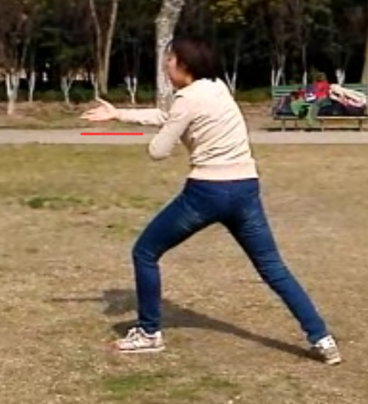 图1-1这个动作,要注意这里脚是丁字步。方向正西。 第22式“樵夫担柴” 图1-1结束后,为图1-2的动作,而后是樵夫担柴的动作,这里注意方位,图1-2的方位也是正西,而后的担柴动作为西南。我的错误是把图1-2的动作朝向正北。 第25式“托天盖地” “托天盖地”后面右手会前插,小凌老师指出手臂要平。见图2。