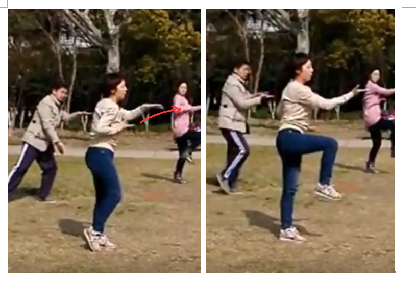 在此动作之后,会抬起右脚,以右脚为轴,旋转180度。我在这个动作中又犯了“散”的毛病,把右脚抬的很高然后旋转。小凌老师指出轻轻抬脚离地即可。这个和“临崖勒马”把脚抬高是一个毛病。 第11式 “川流不息” “川流不息”前是如下图的侧身、双手抱圆,掌心相对,方向正西。我做后面来回穿掌的动作时分3步,1是左手翻掌,掌心朝下后,向正西前穿;2是右手落下,在左手上方正西前穿; 3为右手在左手上,向南划半圆到左肩后回收,左手同时向南穿出。这里小凌老师指出我1的这个动作不对,翻掌就可以了,不要前穿。这个动作练了很久,一直把握不住这个度。看来还要多体会。 同时小凌老师还指出了我前面第七式“鸿雁双飞”到后面2个“闭门推月”过程中的错误。在这个“闭门推月”前有如下图的抬脚穿掌动作。我的穿掌(以下图为例)是右掌从左掌上面穿过去的。而准确的动作时右掌从左掌的下方,掌心相对穿过。