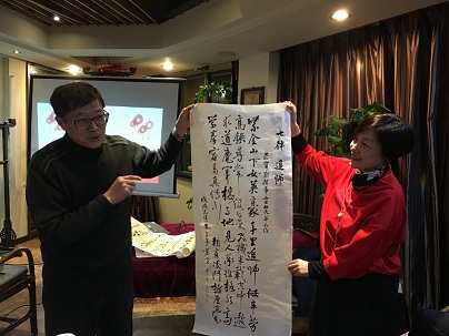 理事长给侃希的礼物是极佳的。一首由他创作的七律诗,由名家亲笔书写的条幅,我们看了称赞不已。师兄发觉一处平仄声稍有欠妥,表示修改后再给侃希。为师兄此举点赞!这种缺憾,会是更圆满的举措。这样内家拳的作风,把我们凌氏团队的精神,体现得更加可贵。