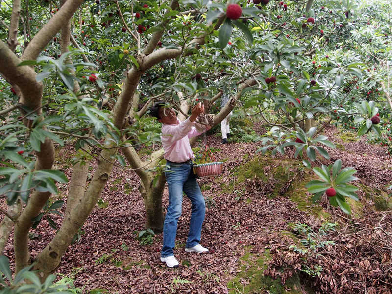 放好行李,山庄杨老板就叫了下属陪我们上山采杨梅。