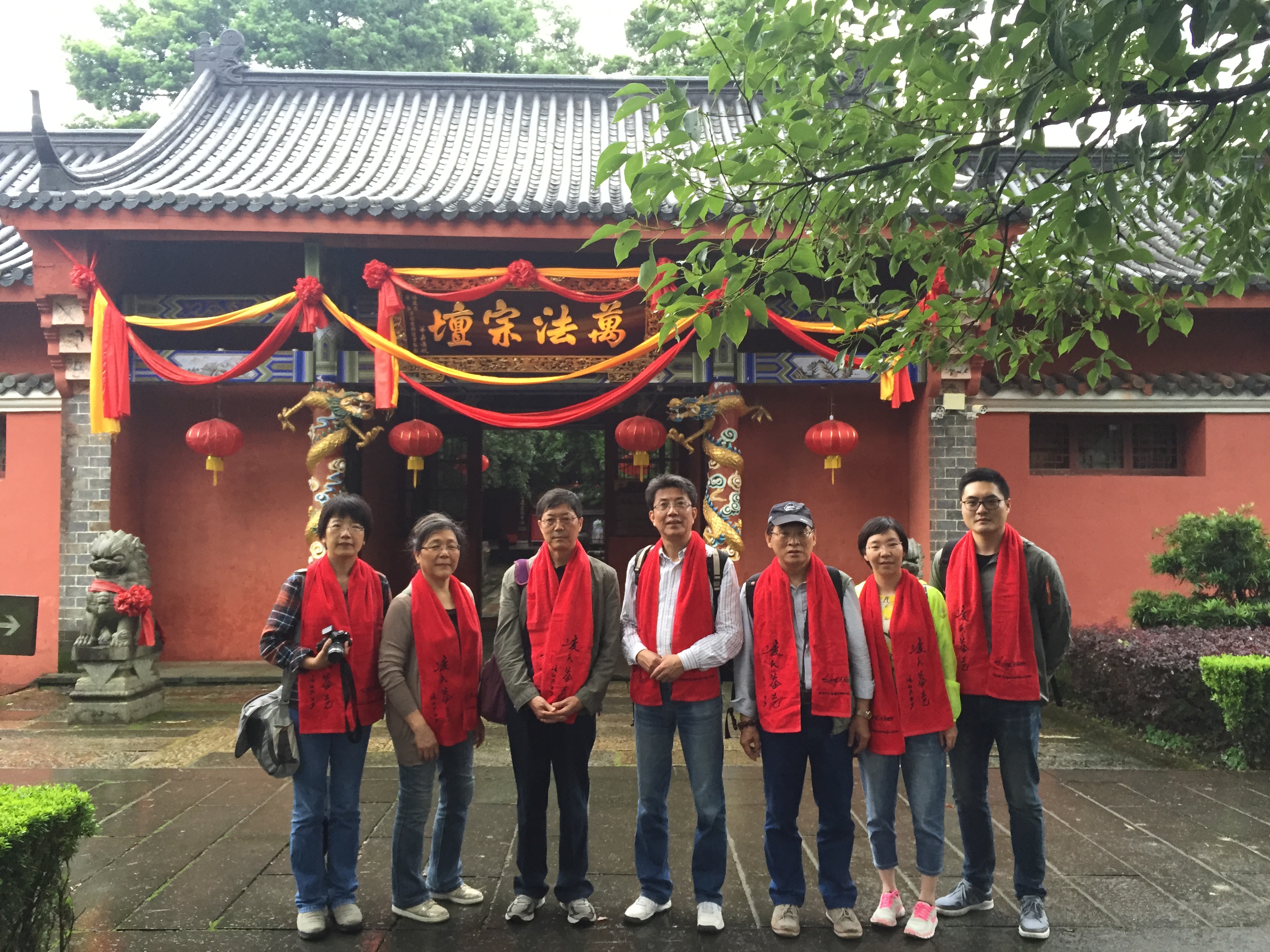 行至万法宗坛,众神聚所,肖师一行系上凌氏拳艺的标示毛巾,合影留念。