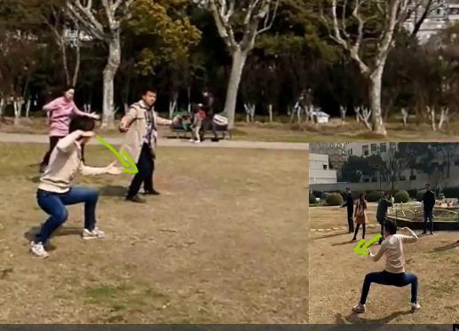 [晓舟老师]:两脚呈“丁八步”站立,身体重心前三后七,双肩撑开,后手中指与前手拇指指尖对齐。