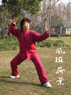 [小凌老师点评金晓庆]:此招掌法如水面之荷叶,双掌的左右摆拽应始终保持在同一高度,不可忽高忽低,这样才能保证路径的正确。
