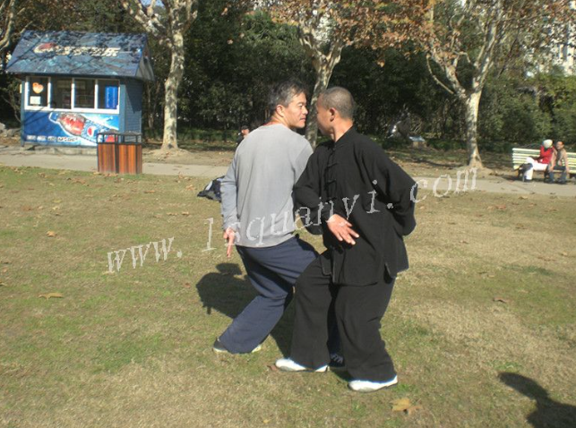 王涛教练对收势开始手挥出去的动作,做了一个实际运用的演示。就是前出的脚别在对方双腿后,然后手横扫过去,这样易于让对方失去重心。