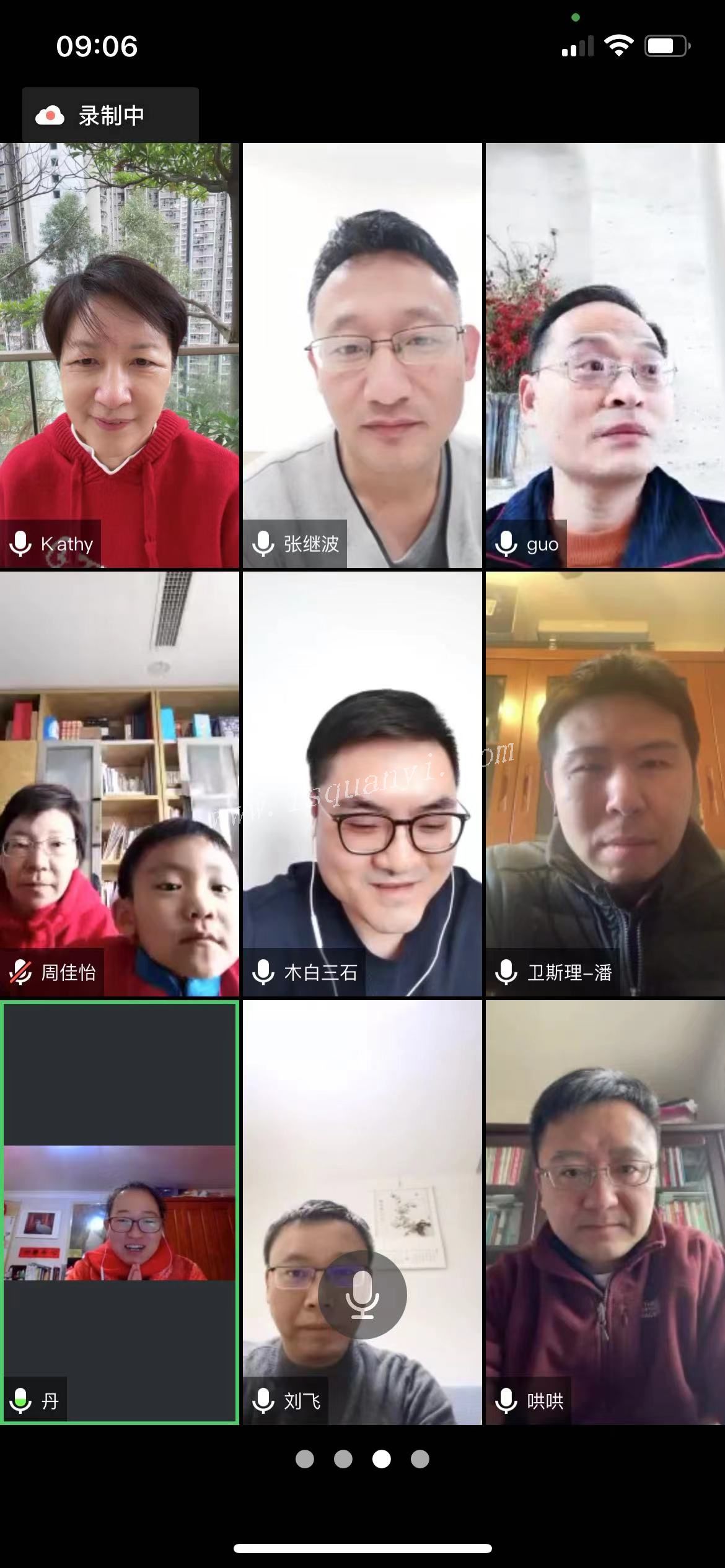 建议以后不管有没有疫情,每年一次,都采取这种形式进行团拜。时间9点到10点,用时一个小时。随着每年线上团拜的进行,参加人数势必会越来越多,时间又有限制。我想以后就以现在的人数为基础,逐步扩大,除了各培训点主教练,以新学员为主,发言也以主教练和新学员为主。